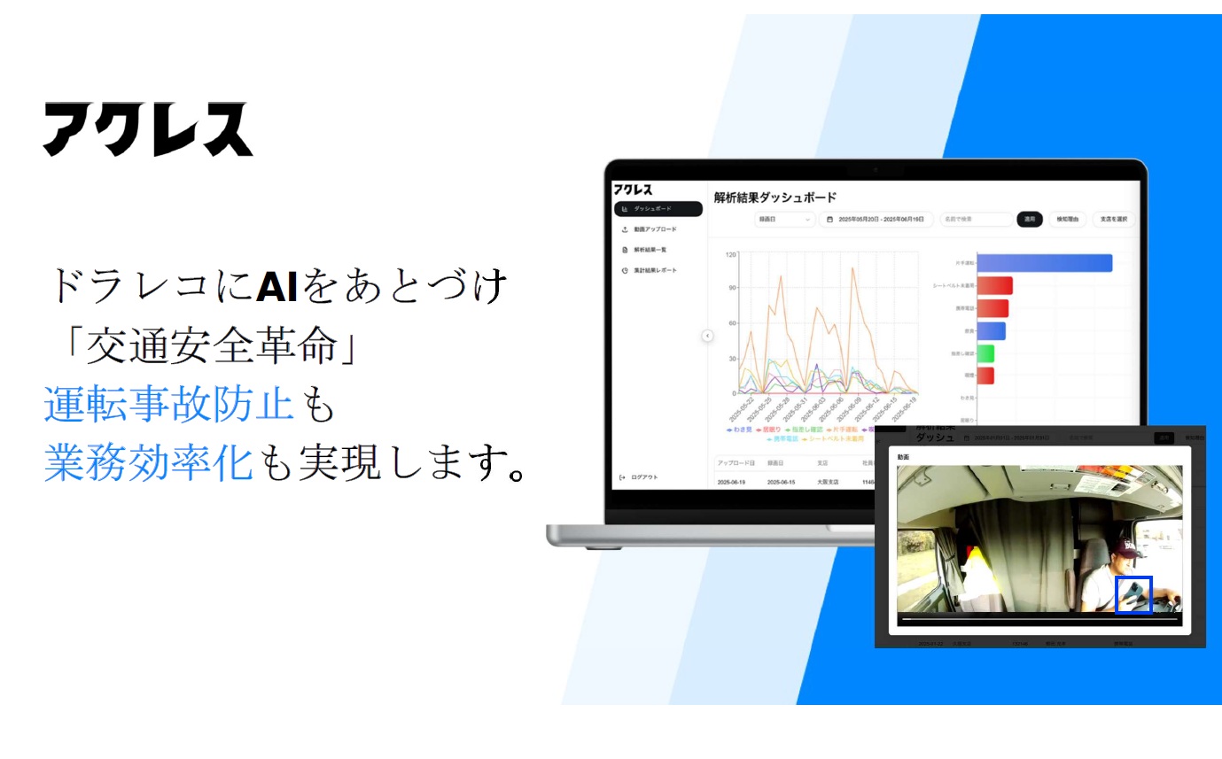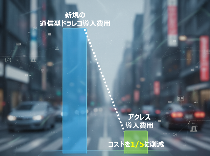 アクレスは、既設のドライブレコーダー(ドラレコ)を活用し、その映像データをAIで解析することで、運転事故防止と業務効率化を同時に実現するクラウドサービスです。高額な機器の買い替えは不要で、既存資産を活かしつつ、新規の通信型ドラレコと比較して導入コストを約1/5に圧縮できる、革新的なソリューションです。