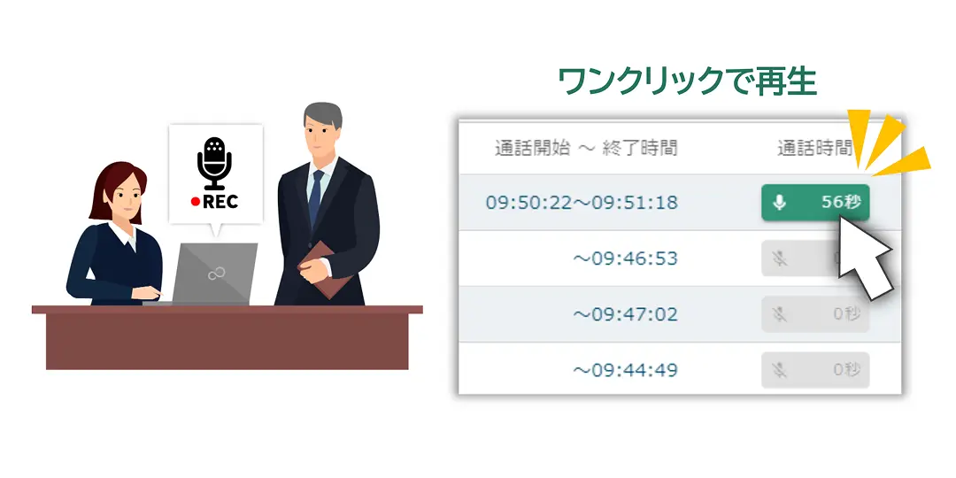 全ての通話を自動で録音。音声データの再生もワンクリックで行え、電話の受け答えの内容を後から確認できます。