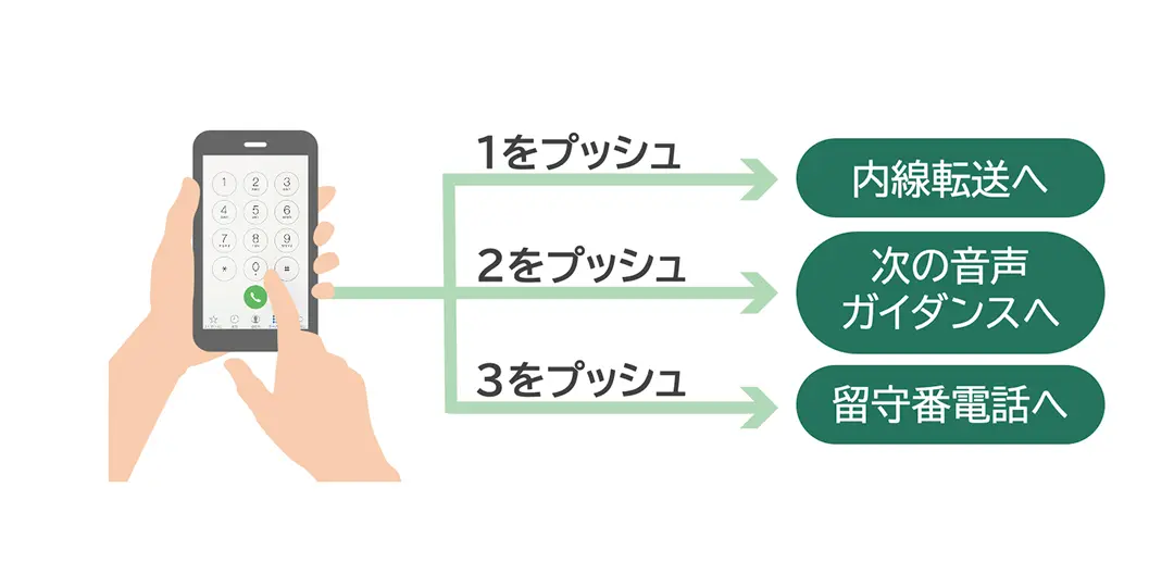 音声ガイダンス後のプッシュボタン操作で、内線転送や、次の音声ガイダンス、 留守番電話などに接続できます。