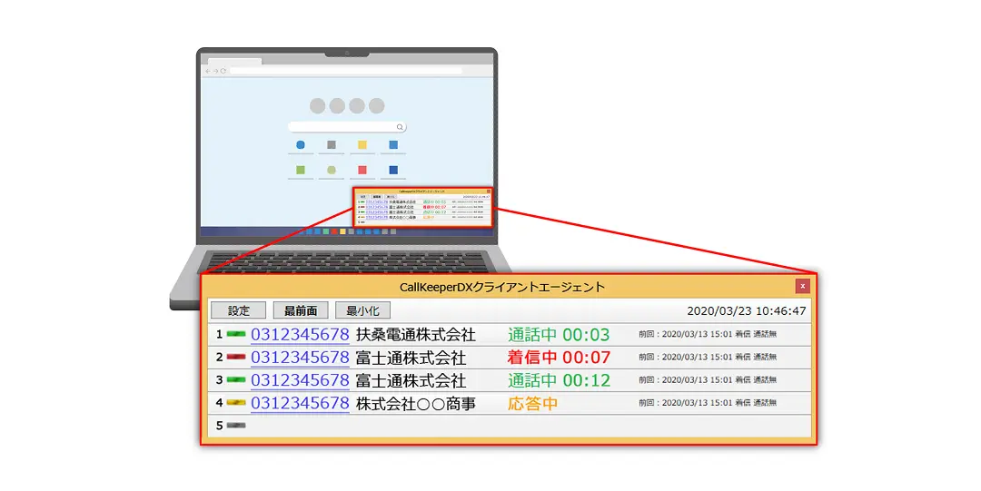 クライアントエージェント機能により、着信があるとPC画面に顧客情報がポップアップで表示されます。