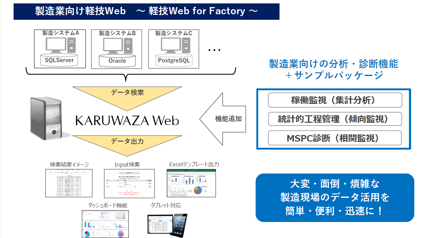 軽技Web for Factoryは、工場で日々蓄積される大量のデータを、誰でも簡単に「検索」して「分析」できるツールです。
