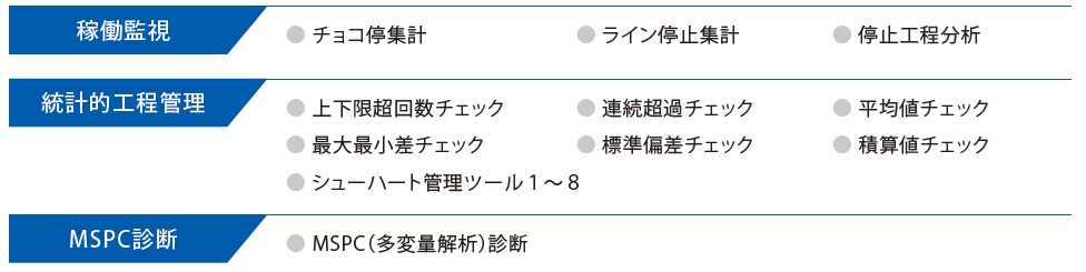 「稼働監視(オフライン分析)」ベテランの「職人技」をデータとして可視化することで、チーム全体の財産に変えます。AIを活用したMSPC診断機能(オプション)も活用すれば、ベテランの経験則に基づいた故障の予兆を自動で検知。技術継承の課題を解決し、チーム全体のスキル向上を支援します。